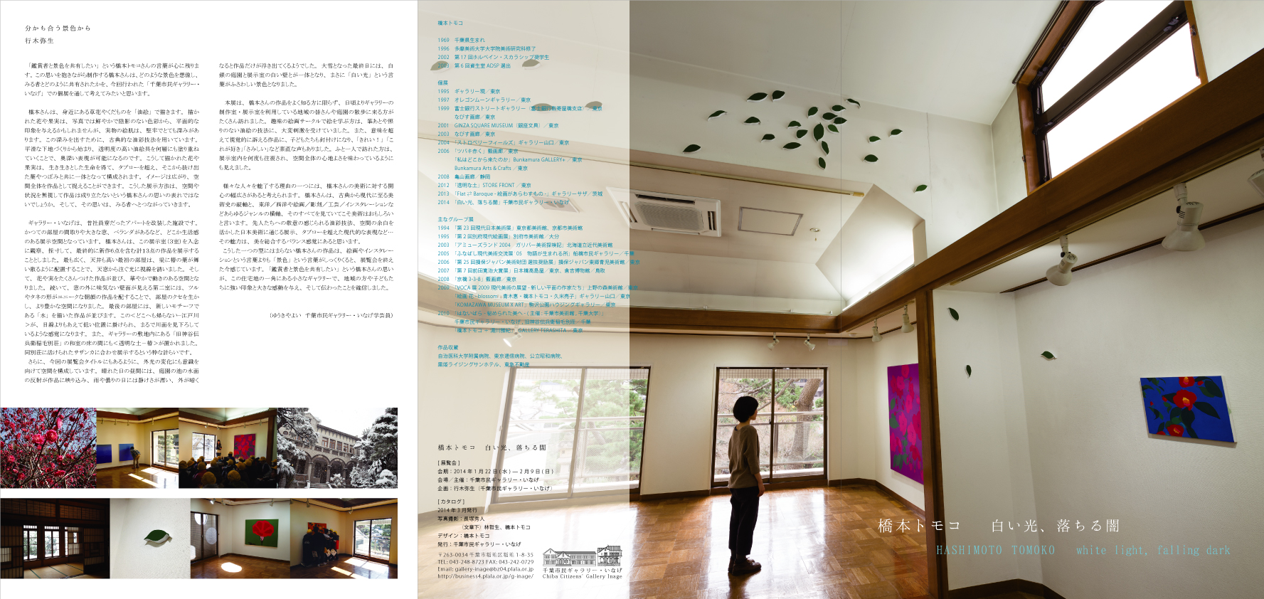 「鑑賞者と景色を共有したい」という橋本トモコさんの言葉が心に残ります。この思いを抱きながら制作する橋本さんは、どのような景色を想像し、みる者とどのように共有されたかを、今回行われた「千葉市民ギャラリー・いなげ」での個展を通して考えてみたいと思います。